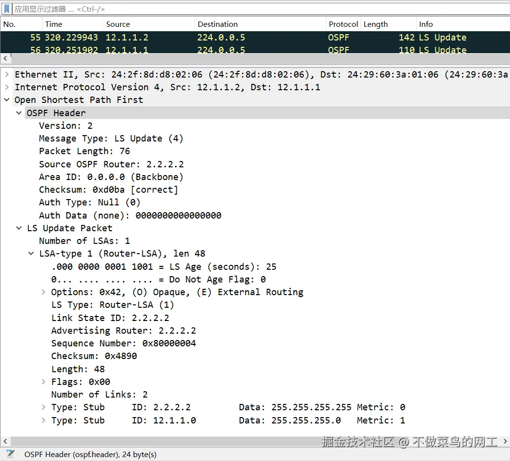 - 功能 :对收到的LSU报文进行确认,确保LSA的可靠泛洪。确认信息为LSA头部。