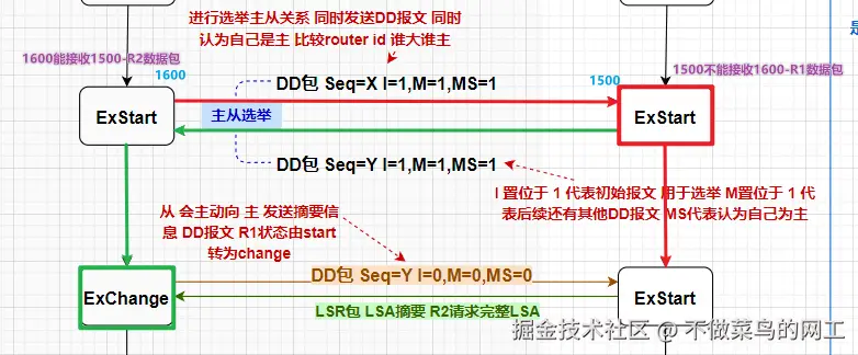 Exchange。 - 主设备 :在接收到从设备的DD报文并回复自己的DD报文后,状态变为