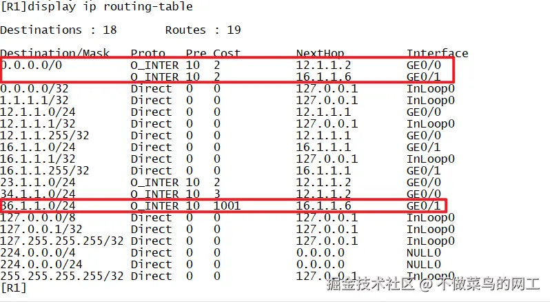 default-route-advertise,可将缺省路由以5类LSA形式注入OSPF域。 - 使用