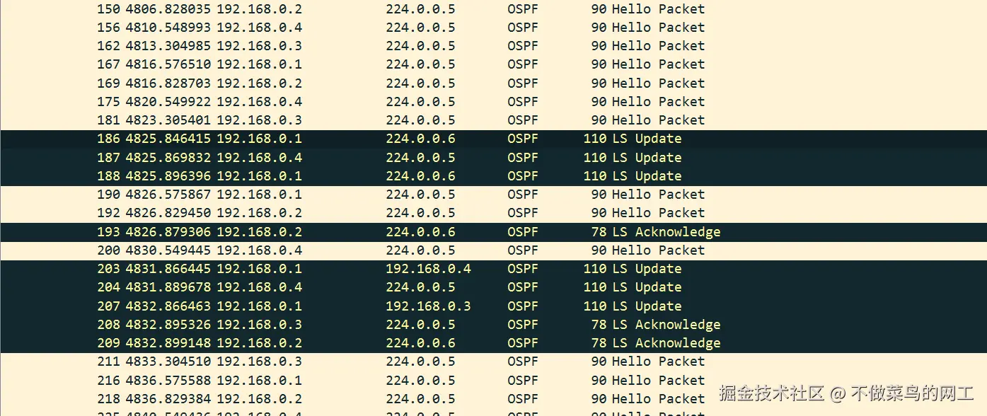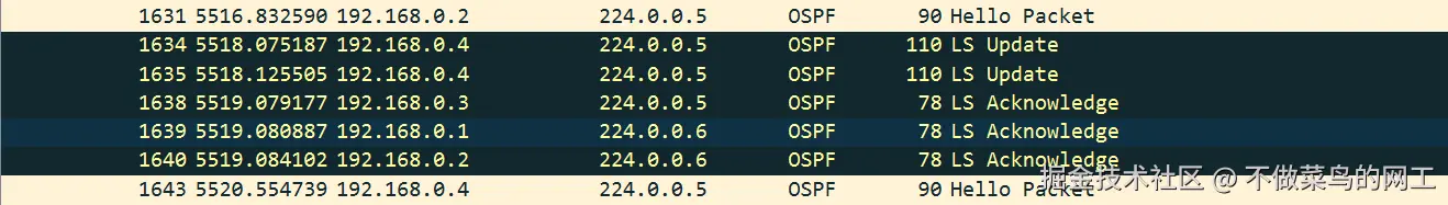 DR和BDR发送组播地址224.0.0.6。 DR向所有其他路由器(224.0.0.5)泛洪更新。