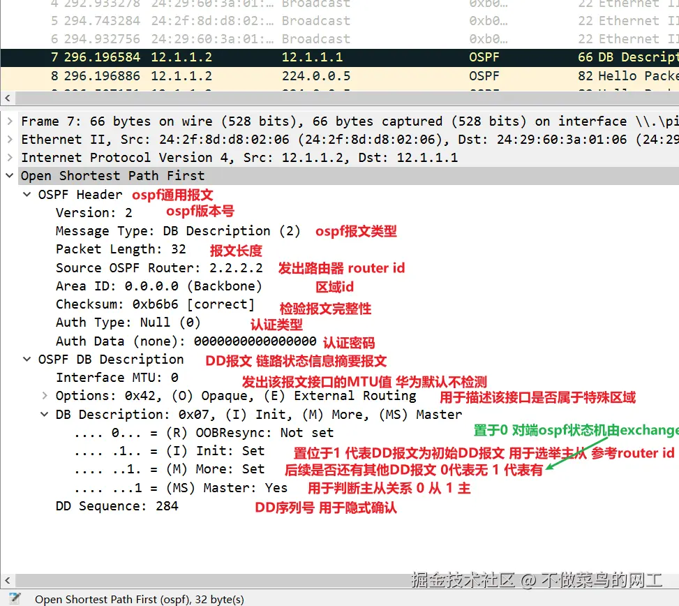 ExStart状态,通过交换空的DD报文 (M=1,MS=1)进行主从选举。Router ID大者为主。