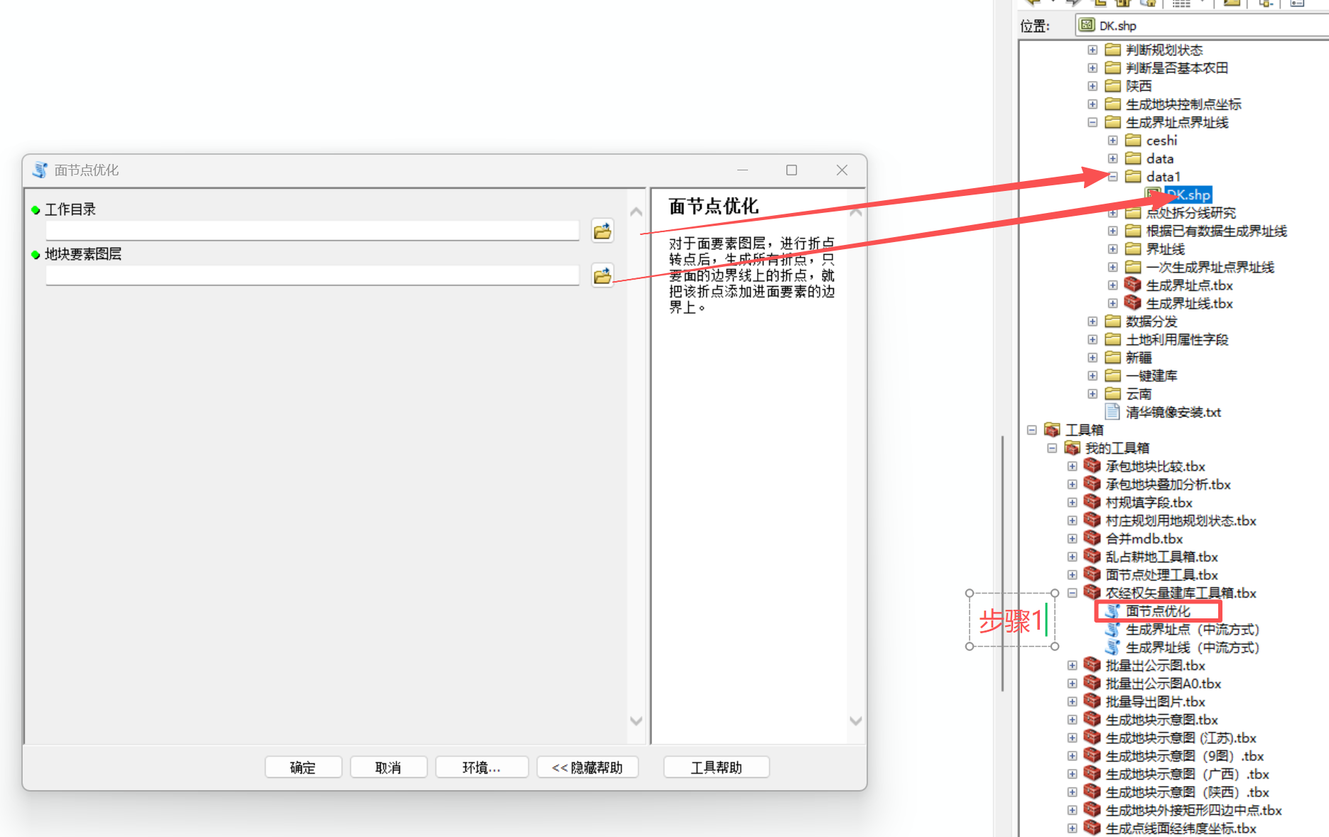 - 1、创建文件夹(工作目录),将DK.shp复制一份到文件夹当中。执行面节点优化。