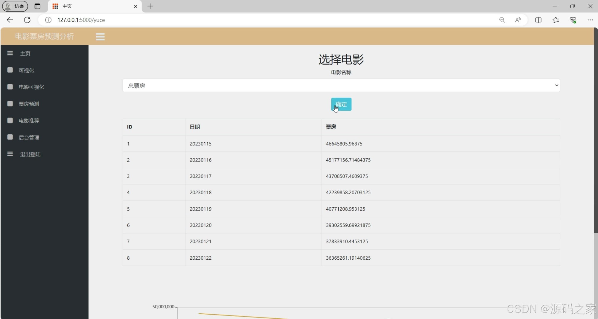 支持选择电影来获取对应的票房数据列表与趋势图表,同时左侧导航栏集成了可视化、电影可视化、电影推荐、后台管理等功能模块,可实现不同系统功能的便捷切换与访问。