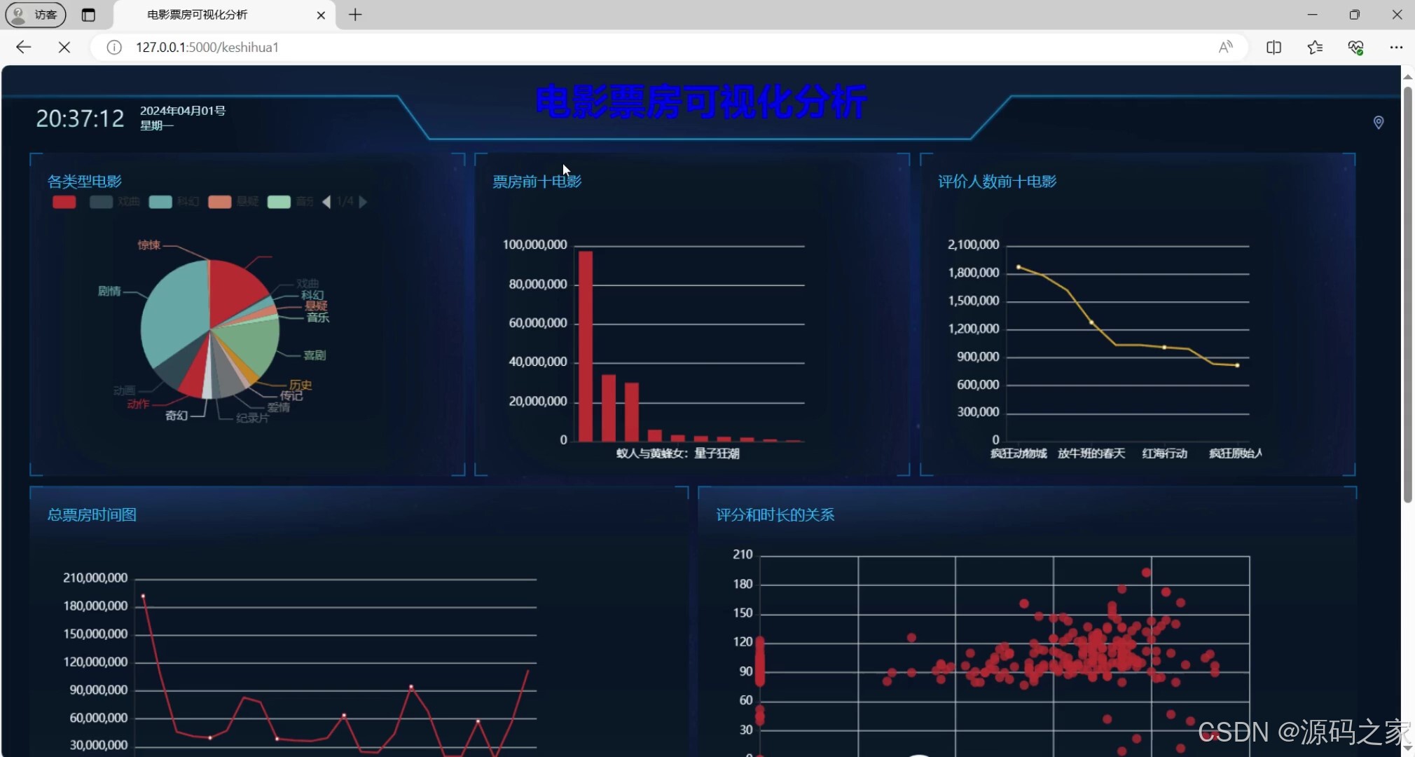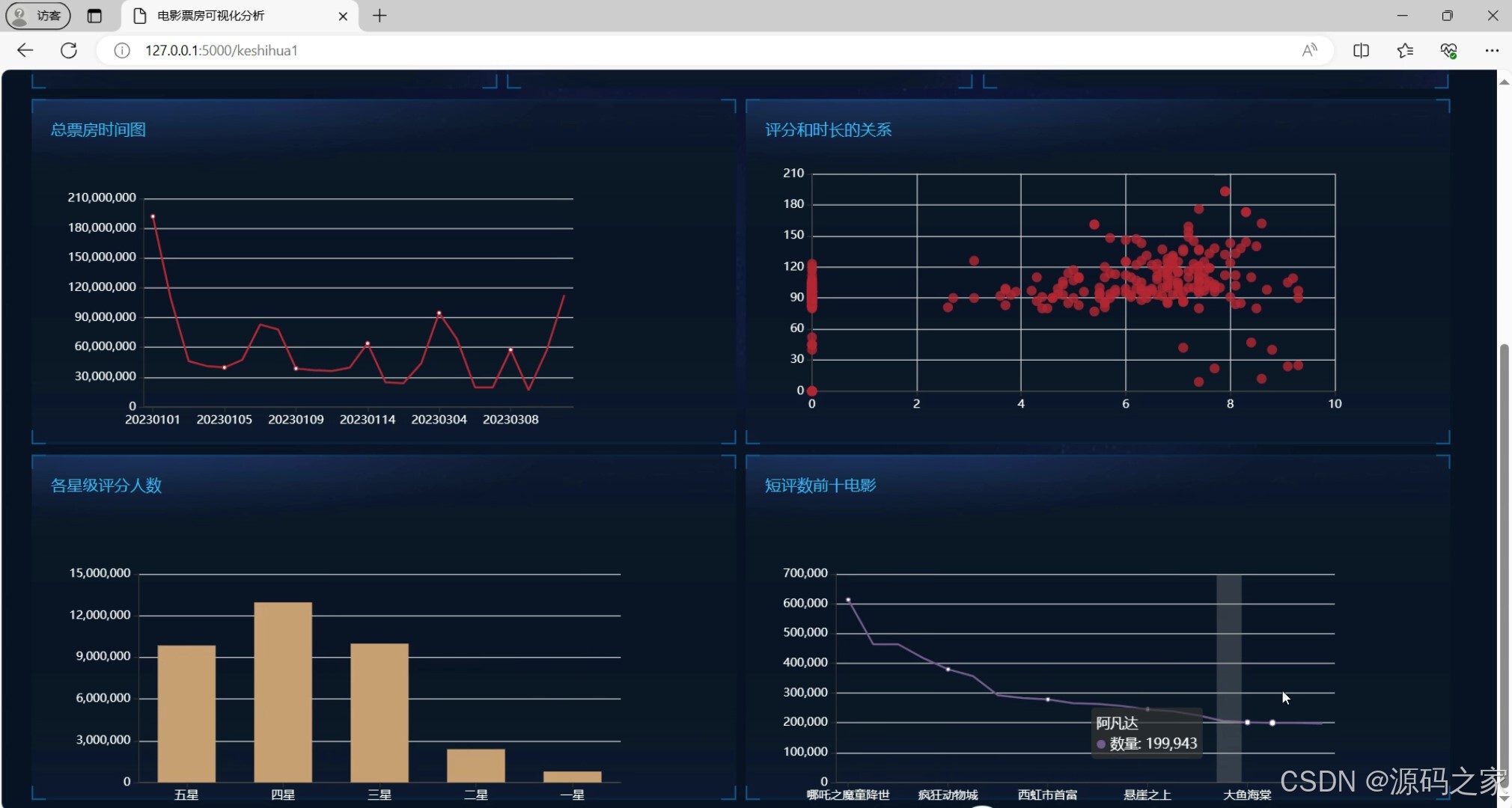 - 数据大屏2:聚焦多维度数据可视化呈现,以折线图展示总票房随时间的变化趋势,散点图探索电影评分与时长的关联,柱状图呈现各星级评分的人数分布,折线图展示短评数前十电影的热度表现,从不同维度补充电影数据的可视化分析。