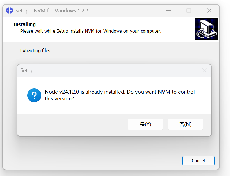 如果你在安装快结束时,弹出下面这个提示窗口,提示检测到本地有 Node.js 版本,提示是否交给 nvm 管理,不论点击 是 还是 否 ,nvm 都安装不成功,可以尝试卸载本地 Node.js 后再安装 nvm。