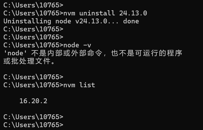 如下,卸载后敲 node -v 命令提示命令不存在。