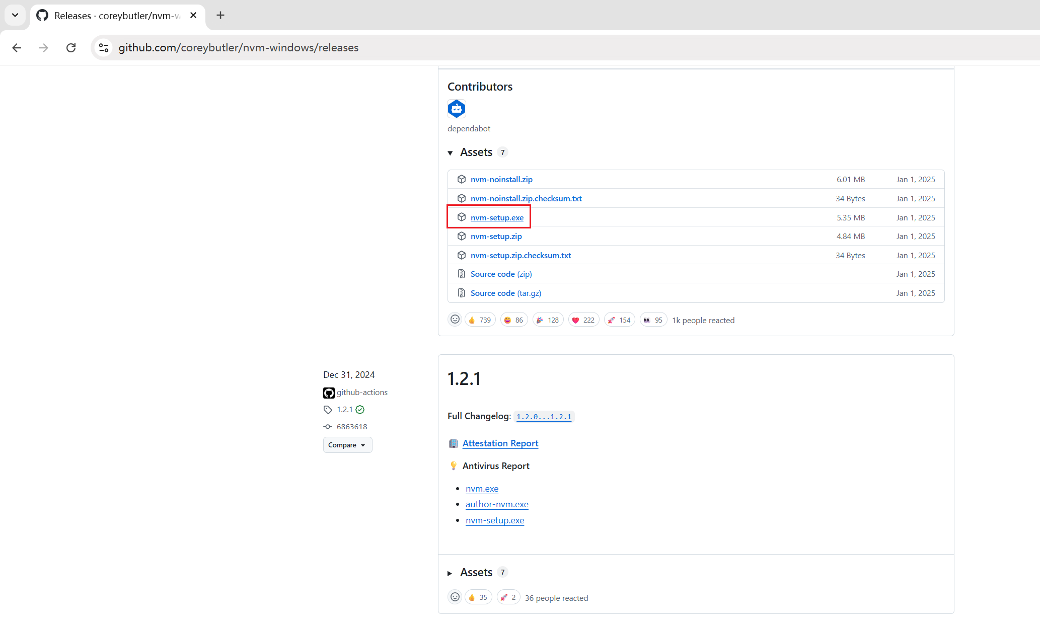打开 Github,找到 nvm-windows 仓库(https://github.com/coreybutler/nvm-windows/releases),点击最新的安装包下载。