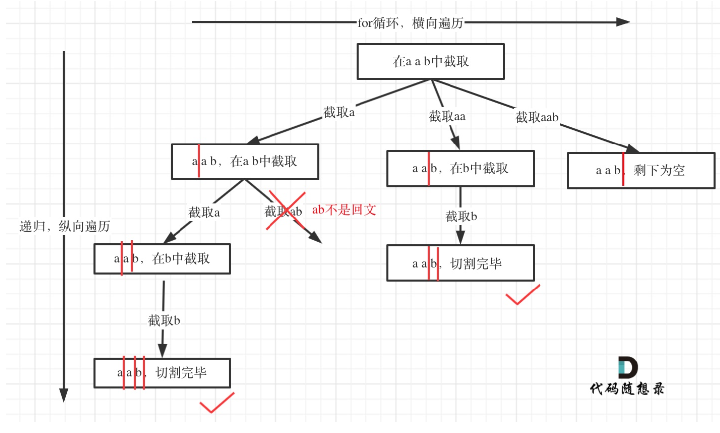 回溯:递归返回后,移除 path 最后一个元素,回到切割前的状态,尝试下一个切割点。