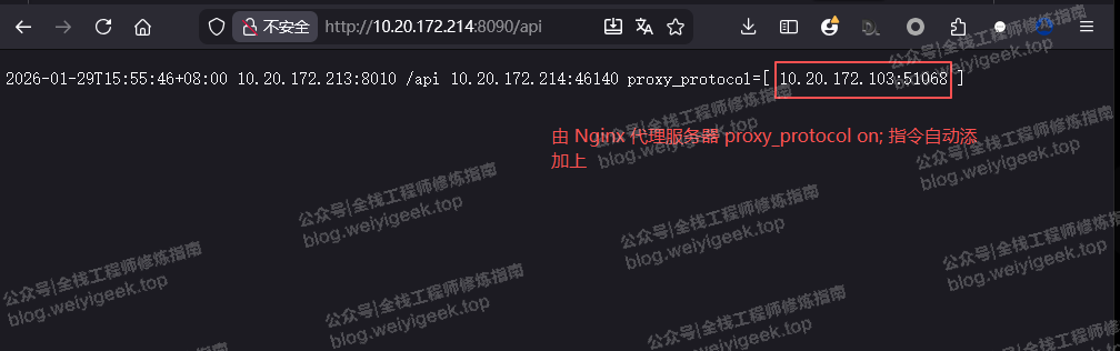 再次,使用浏览器访问 http://10.20.172.214:8090/api 此时无需携带 proxy_protocol 协议头,即可正常响应数据,并且在上游服务器中可以看到从 proxy_protocol 协议头取得的真实IP地址和端口。