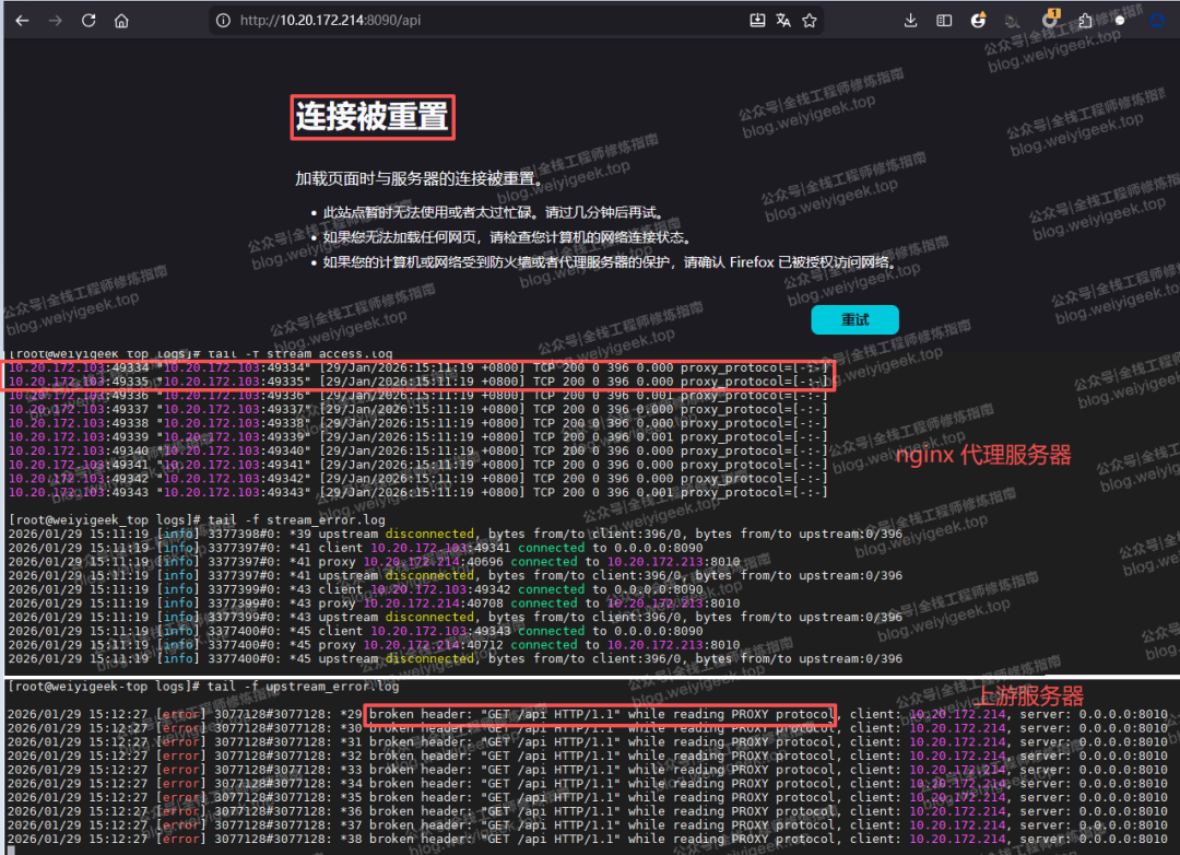 步骤 04.在客户端(10.20.172.103)上使用浏览器与 telnet 命令验证场景1,首先使用浏览器访问 http://10.20.172.214:8090/api 此时未携带 proxy_protocol 协议头,由于上游需要解析 proxy_protocol 头才正常响应数据,否则如下图所示,显示连接被重置: