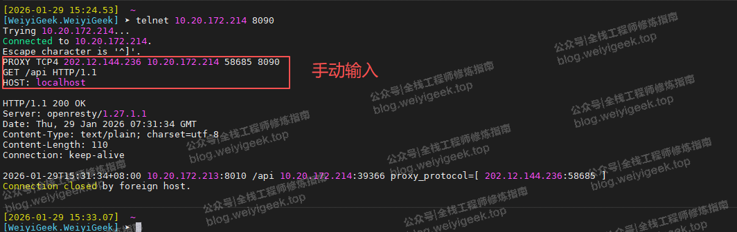 同样,我们使用 telnet 命令进行测试,不同的是这次我们需手动输入 proxy_protocol 协议头,以及要请求的 url 路径,将如下图所示,成功响应 api 接口数据,并且在上游服务器中可以看到从 proxy_protocol 协议头取得的真实的客户端IP地址及端口。