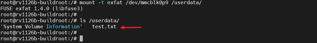 执行如下命令取消默认的userdata分区挂载,以exFAT格式挂载userdata分区: