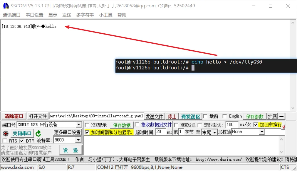开发板可以通过以下命令设置串口波特率(当前仅支持9600)并发送数据到PC,命令如下:
