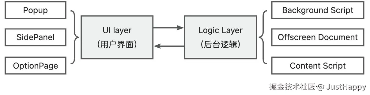 虽然我们通过 Web 技术来开发浏览器扩展,但它的形态绝对不是一个单纯的网页中的网页,而更像是一个完整的应用,有自己独立的一套运作体系,这个"应用"大致的构成成分如下