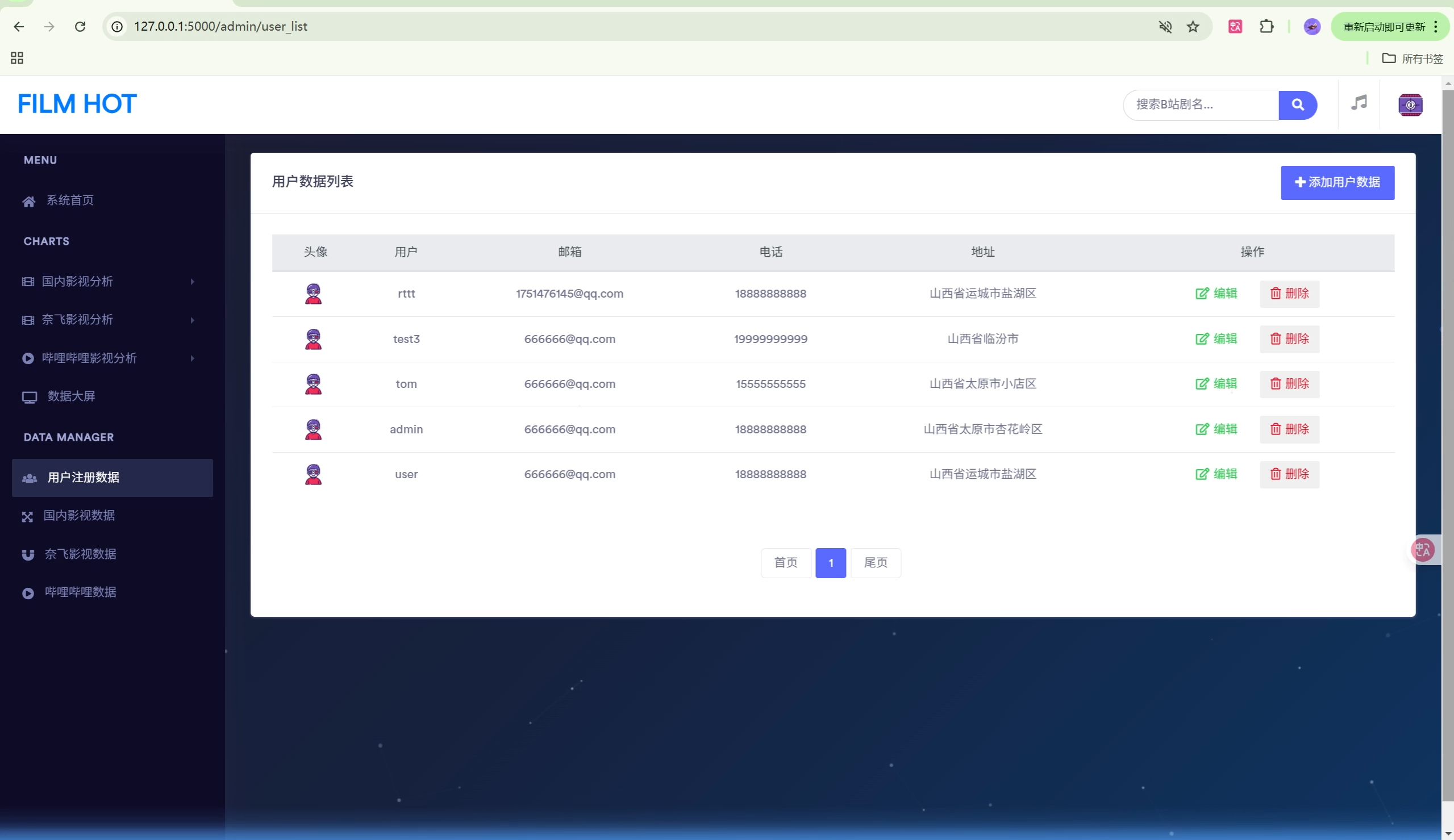 | 数据表 | 4个 | user, film_information, netflix_titles, bilibili_media |