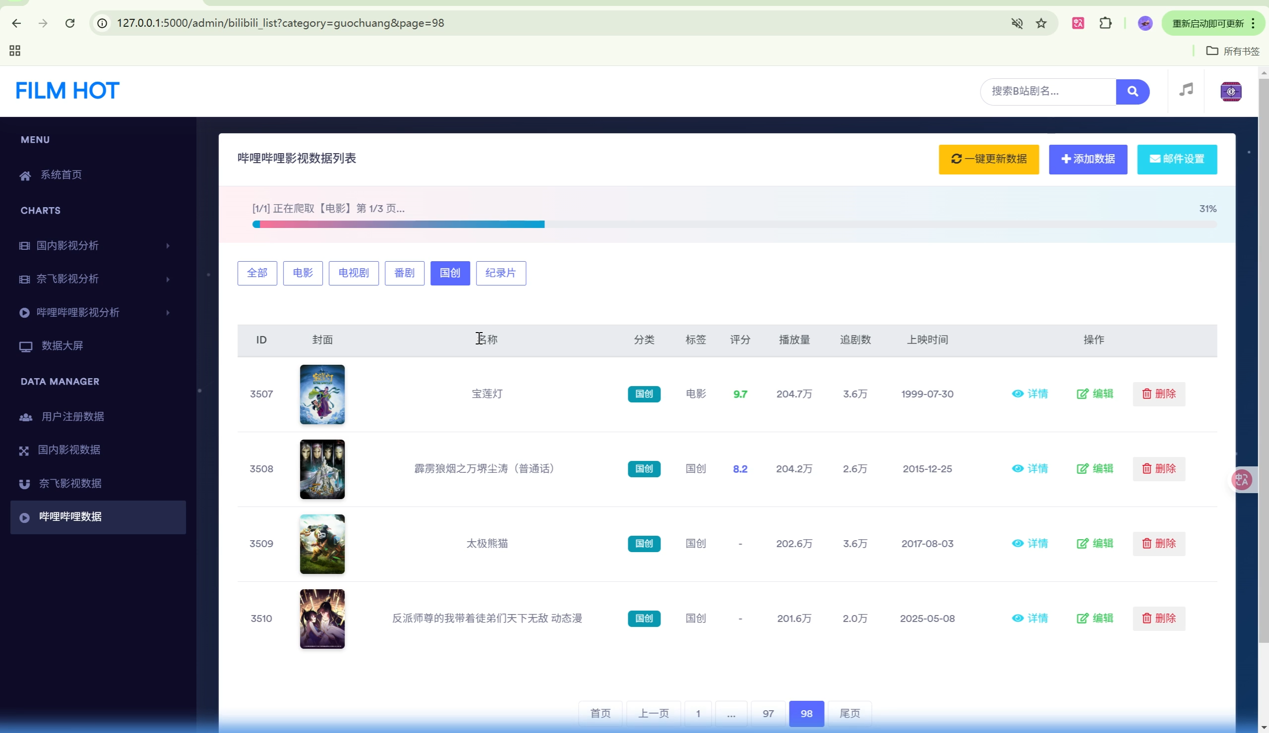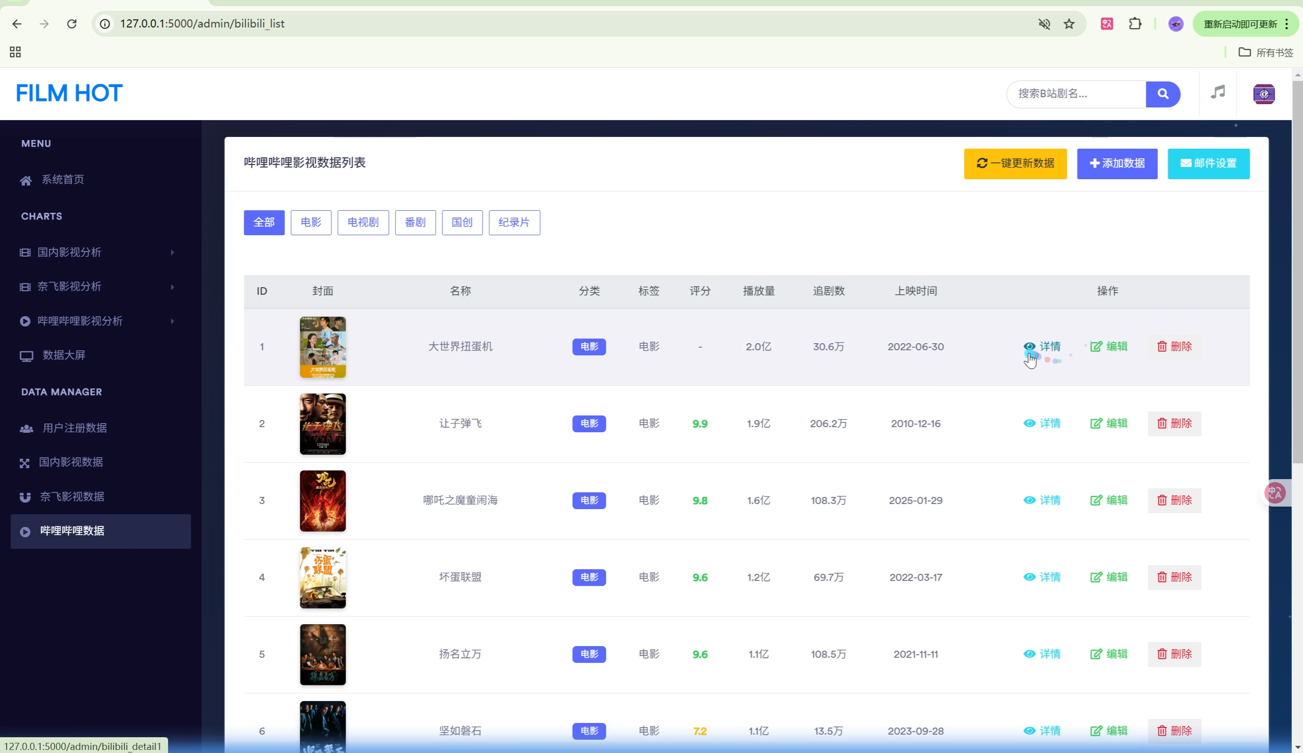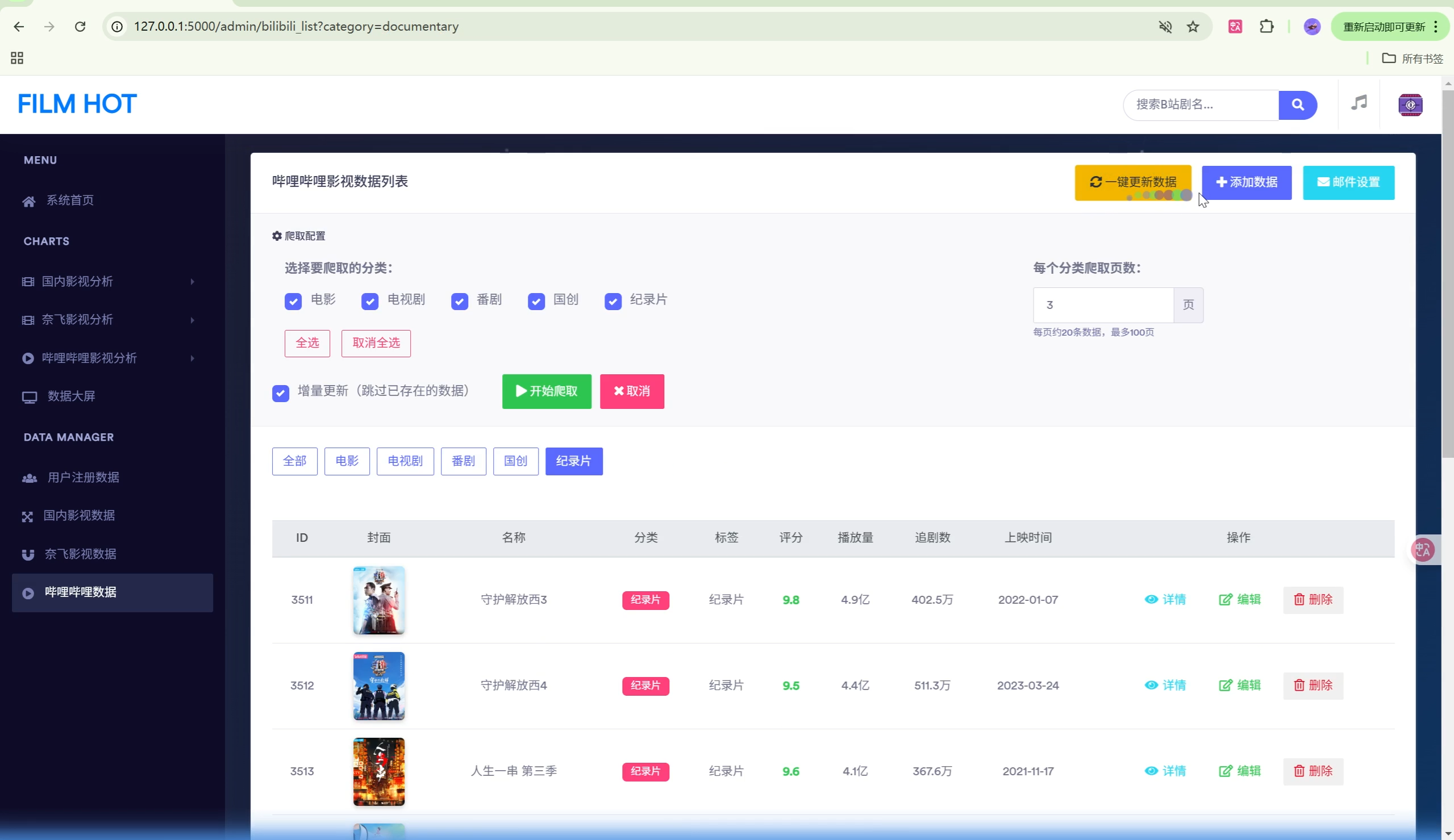 | 数据爬虫 | B站影视数据自动采集,支持5个分类,可配置爬取参数 |