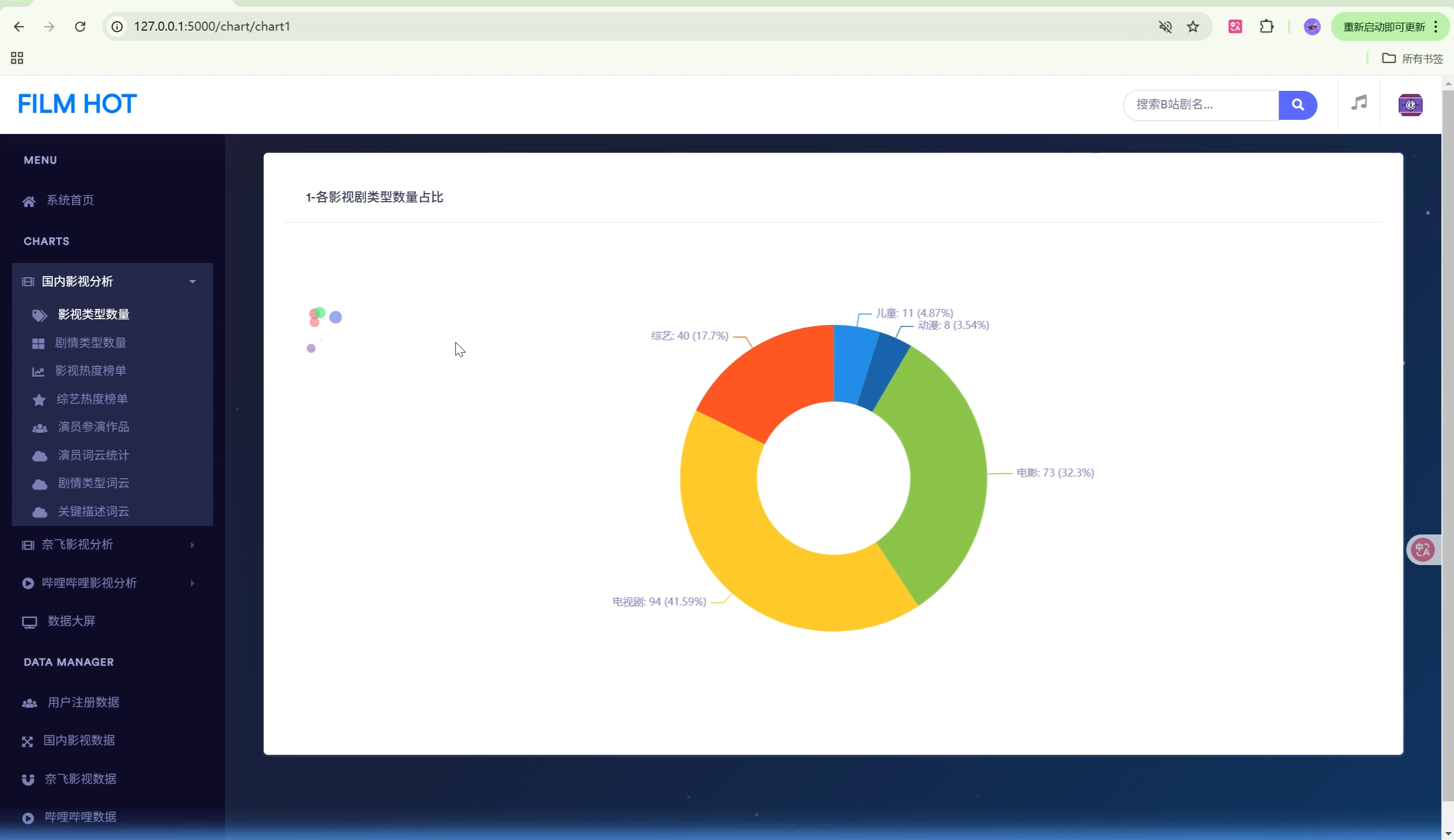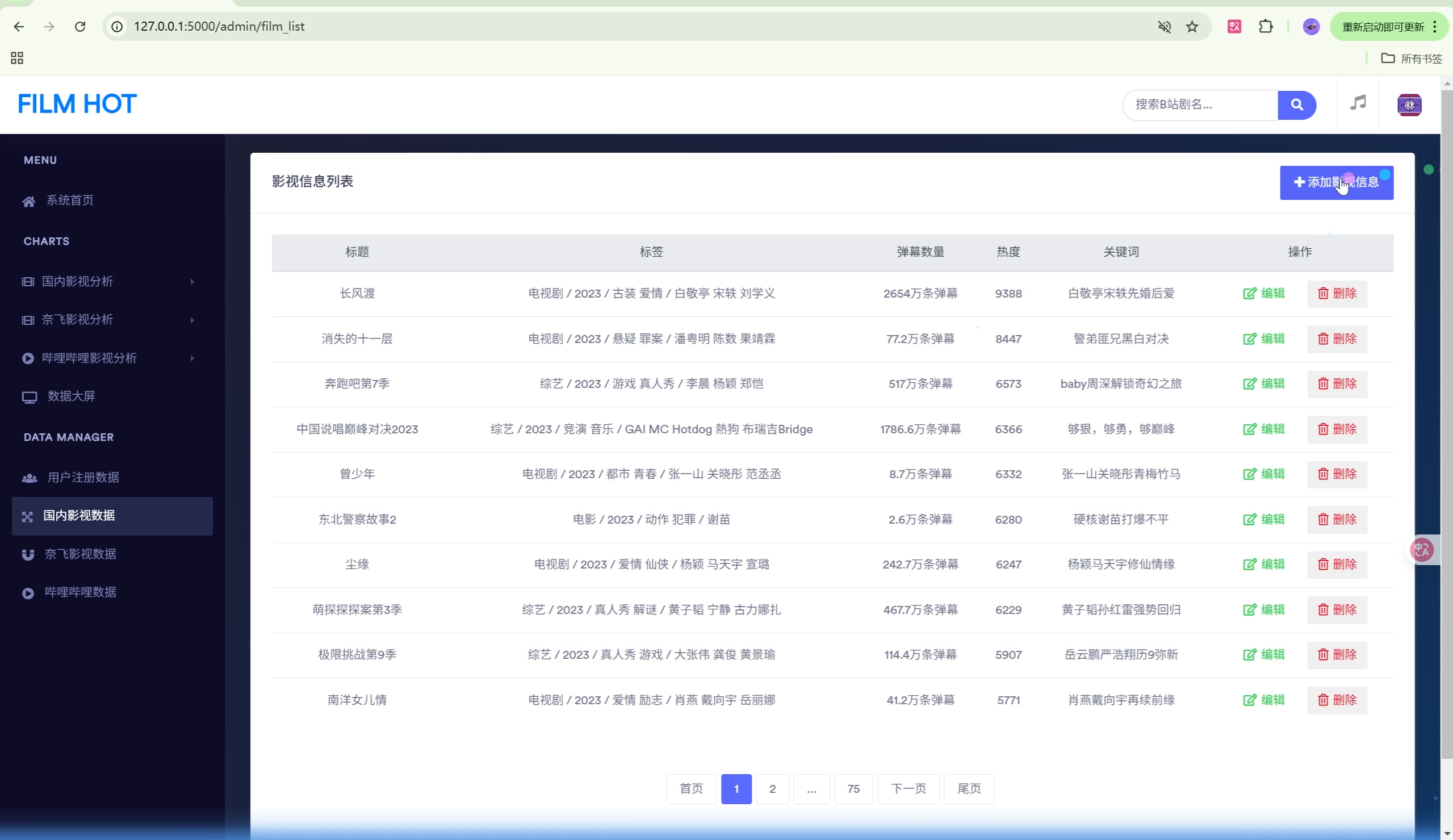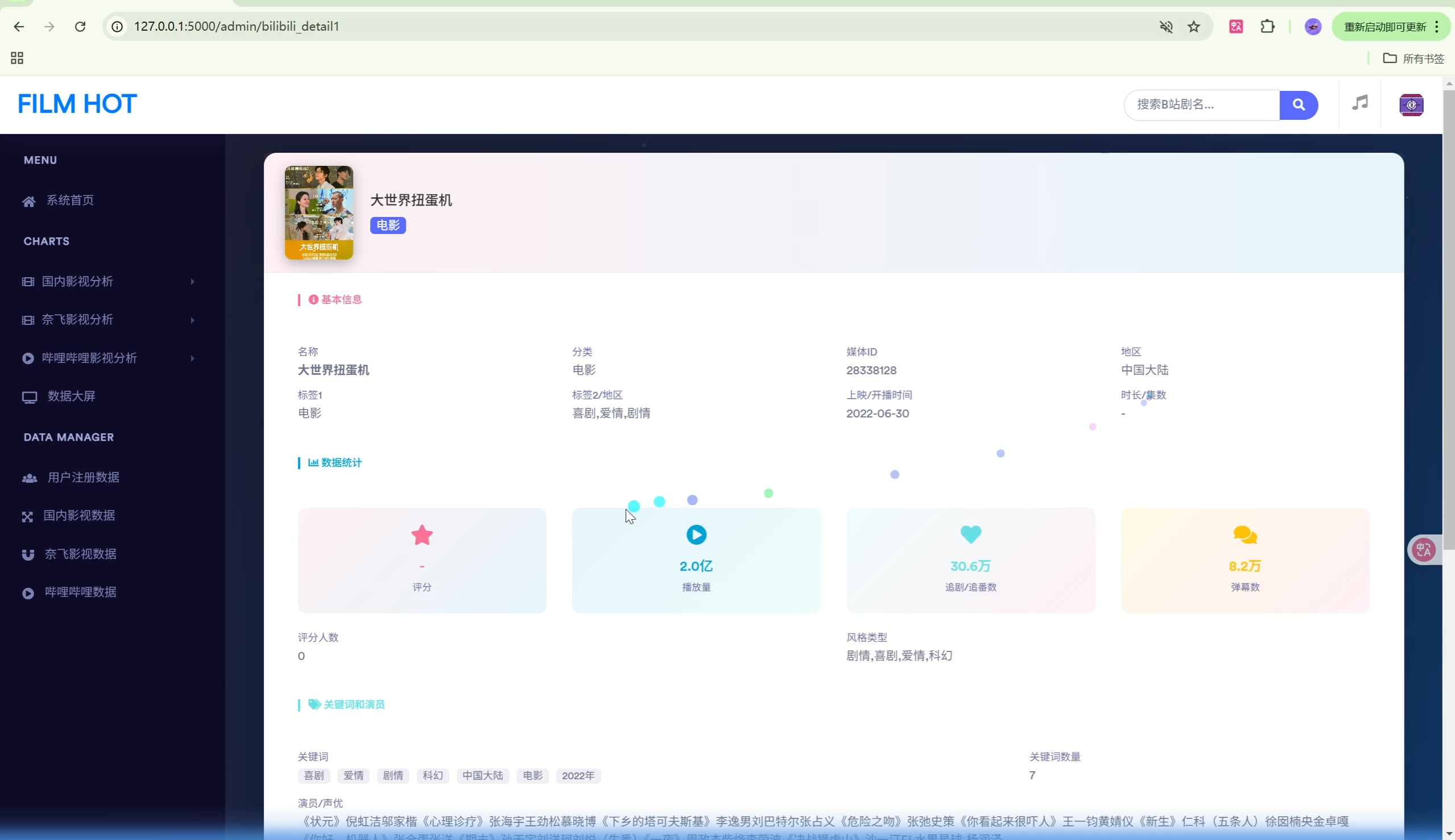 | 数据可视化 | 20+种图表类型,两个数据大屏(影视剧大屏、B站科技风大屏) |