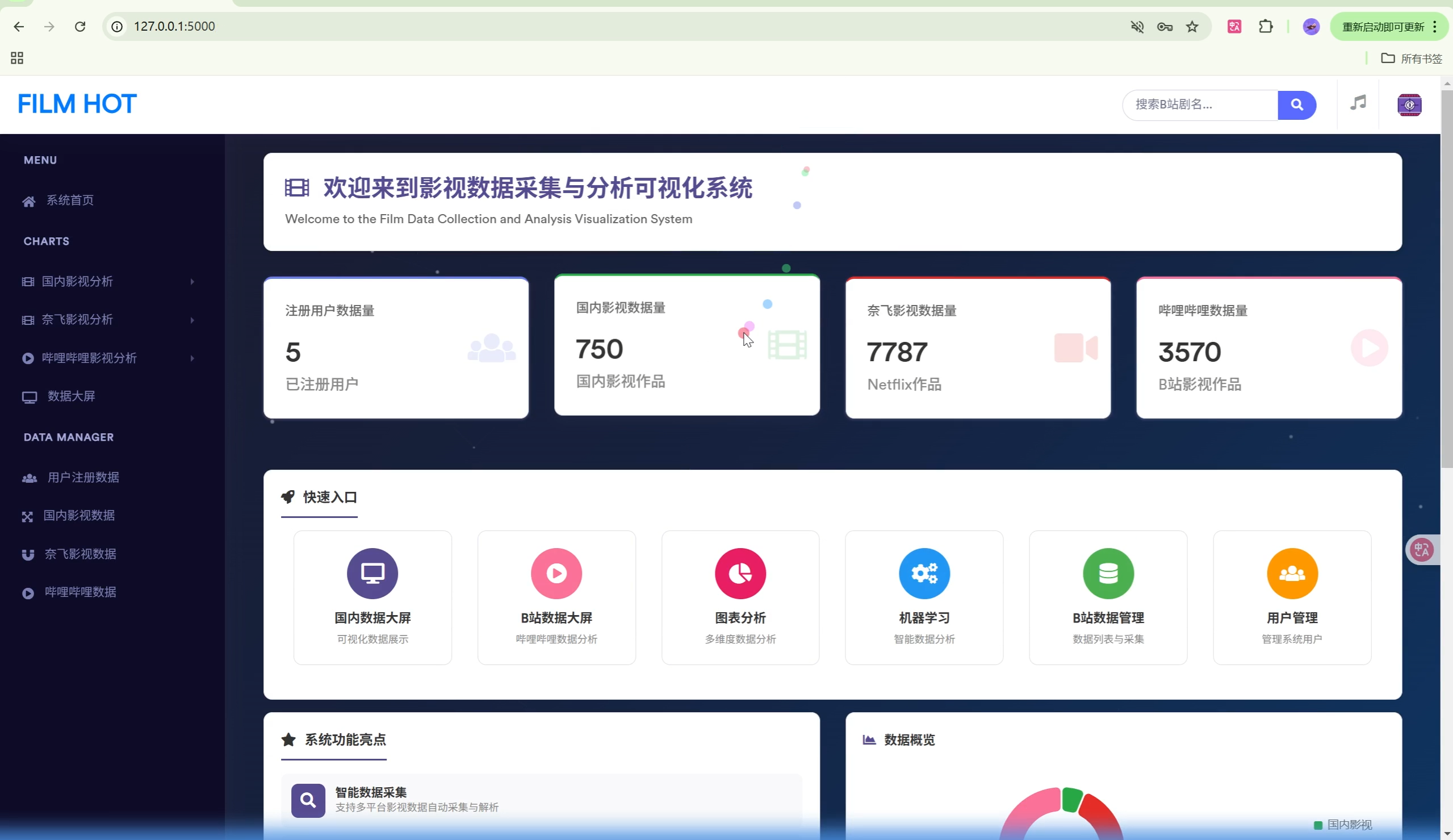 本系统是一个综合性的影视数据管理与分析平台,集成了数据采集(爬虫)、数据存储、数据可视化、机器学习分析等功能。系统支持多数据源(哔哩哔哩、Netflix、豆瓣等),提供丰富的数据图表展示和智能分析功能。