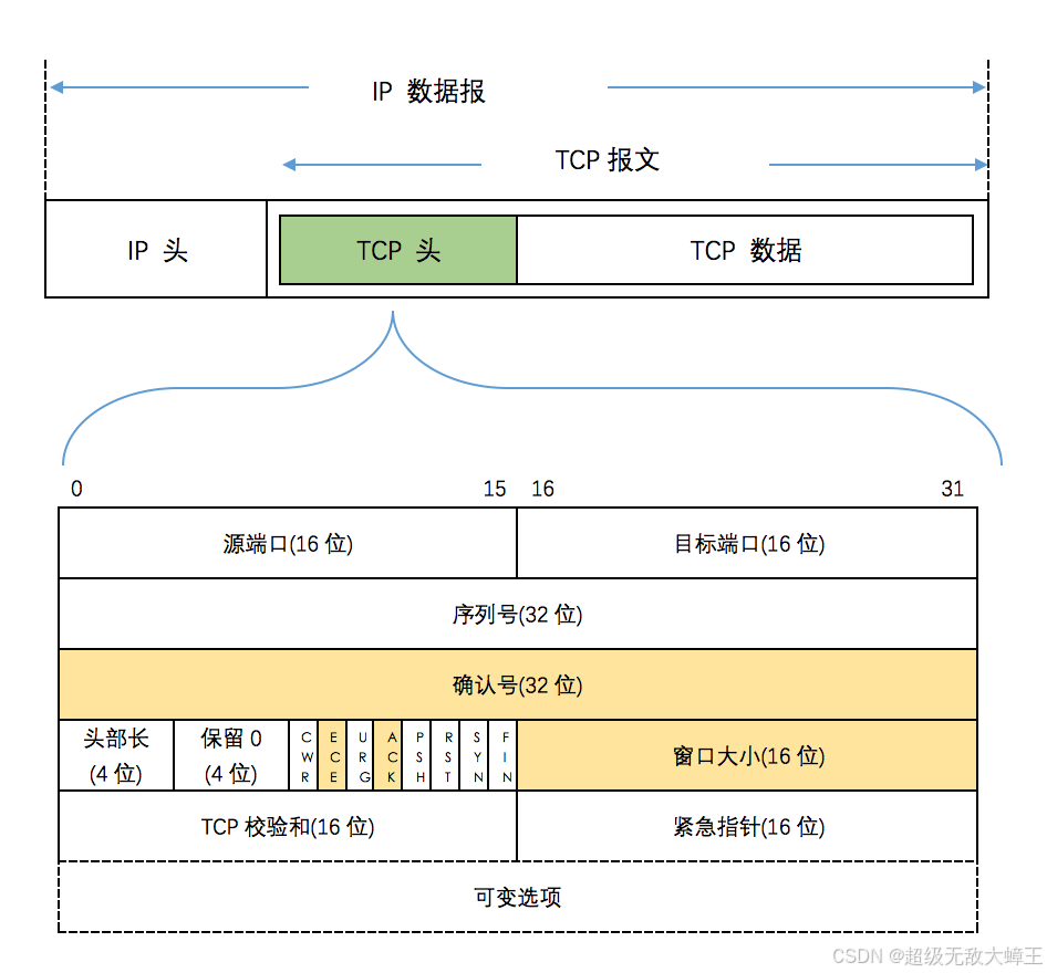 TCP头部字段主要有序列号, 确认号, 源端口, 目的端口号, 标记位,头部长度, 窗口大小等, 其中源端口和目的端口都是16位,源端口是发送方使用的端口号, 目的端口是接收方使用的端口号, 序列号和确认号都是32位, 序列号可以保证数据的有效性,确认号可以保证数据的可靠性, 下面我们来逐个分解。