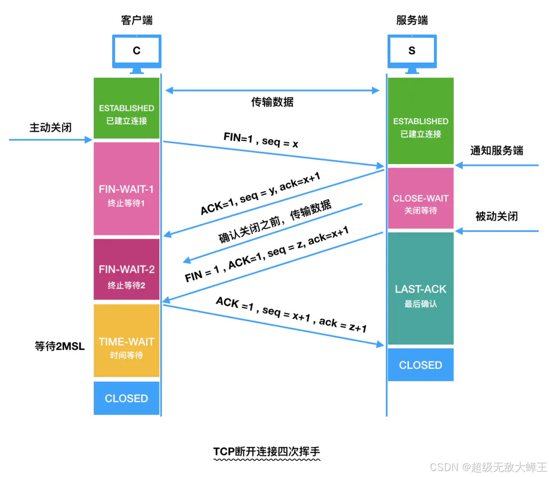 - 客户端在TIME_AWIT状态经过2个MSL后,就进入了CLOSE状态, 客户端的连接也断开。