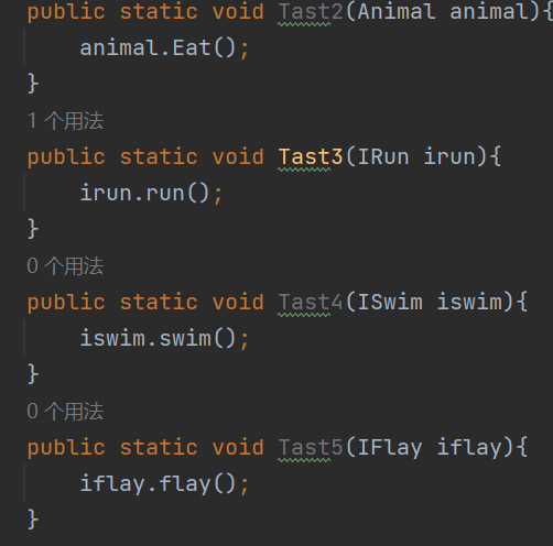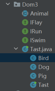我们分别写了,一个动物抽象类当作父类,一个行为"飞"的接口;行为"跑"的接口;行为"游泳"的接口;