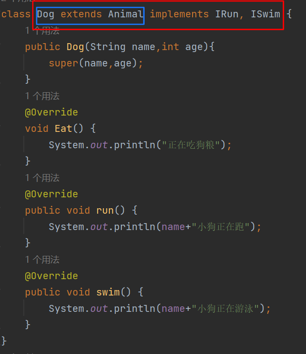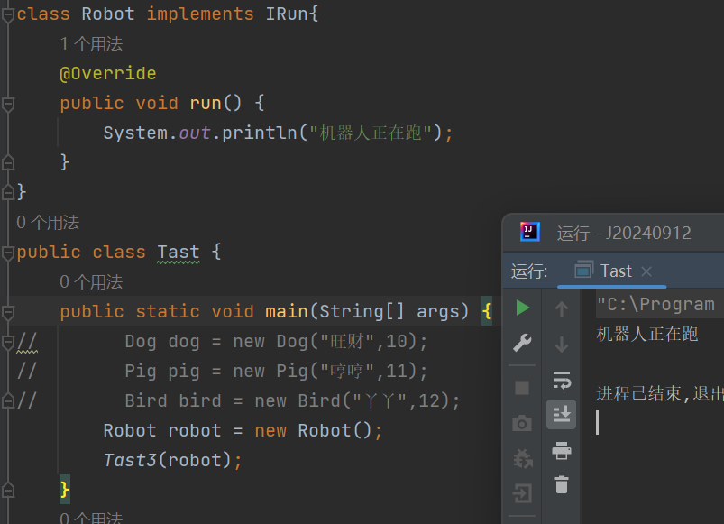 例如:狗,猪,鸟,都可以归为我们的动物类,并且同时具备:飞 || 跑 || 游泳;等行为,我们也可以设计一个机器人类虽然不具备"动物类"的属性,但是具备某些行为;