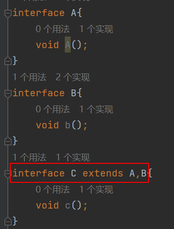 我们可以看到 接口C同时继承了 接口A 与 接口B 而,我们在学习类的时候,已经知道Java不支持多继承;这是因为在 接口中 extends 并不是继承的意思;而是 "拓展"意为:接口C具备了 B 和 C的功能;