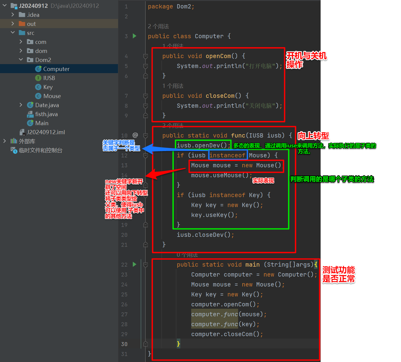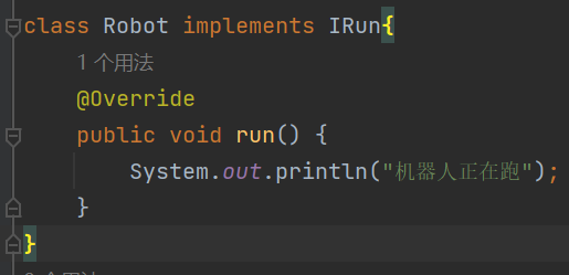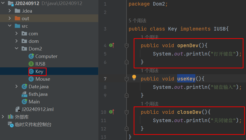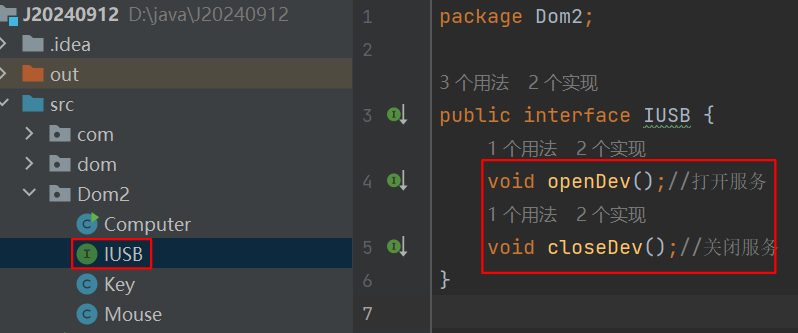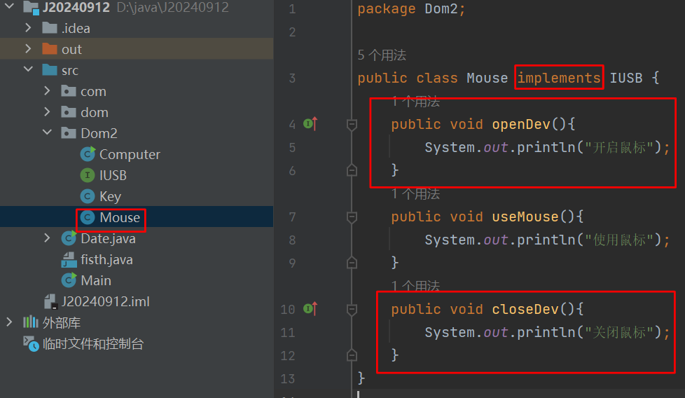 2.然后new一个Mouse类让类与接口实现关系,并且重写开启,与关闭的方法