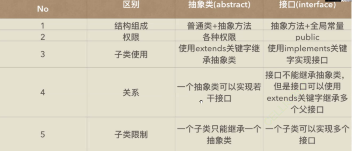 **接口:**接口中不能包含普通方法,子类必须重写所有抽象方法;
