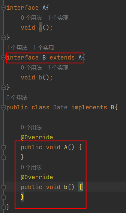 我们看到,当B接口继承了A接口时,Date类与接口实现关系时就需要同时重写接口A和接口B的方法;