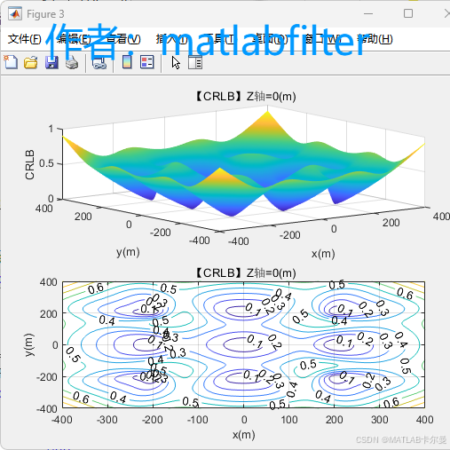 - CRLB 的三维曲面图与等高线地形图。