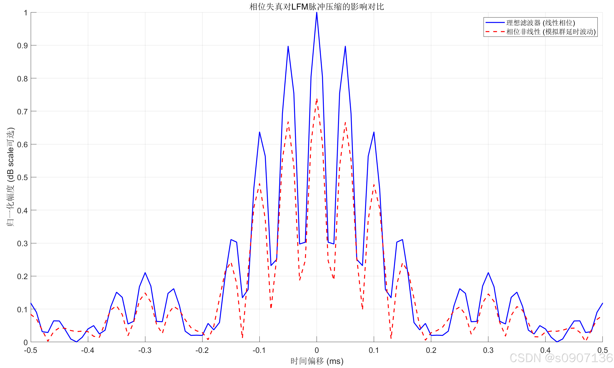 - 非理想情况 :如果滤波器的相位是非线性的(即群延时随频率变化),那么LFM信号中不同频率分量的延迟时间将不同。
