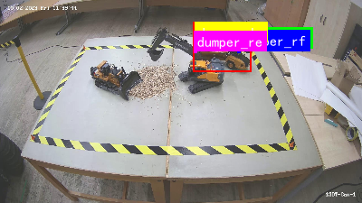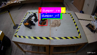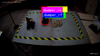 这张图片展示了自卸车多部件识别与定位任务的场景。画面中是一个带有黑黄警示条纹的矩形区域,区域内分布着多个物体。左侧有一个深色机械装置,可能是自卸车的部分组件;中间偏左位置有一个红色标注框,内部是黑色物体,对应"dumper_rf"标签;上方粉色标注框内文字为"dumper_re",黄色和绿色标注框也分别对应不同部件标识。区域右侧有一堆颗粒状物料,可能是模拟的自卸车运输货物。背景可见室内环境,地面为灰色,边缘有木质结构和其他物品。该图片用于自卸车多部件识别任务,通过视觉标记(颜色框、文字标签)明确各部件位置与类别,帮助模型学习部件的空间关系与特征,是实现精准定位与分类训练的关键数据样本。