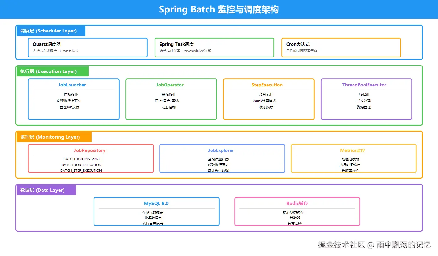 - Spring Batch核心层:Job→Step→Chunk的处理流程,包含Reader、Processor、Writer三大组件
