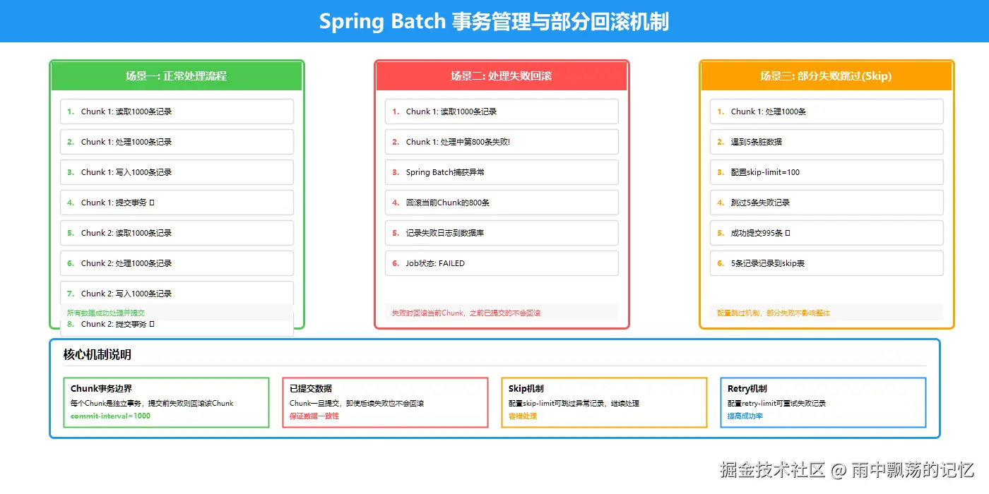 想象一下:你需要处理50万笔工资代发,如果第49万笔记录因为银行卡号错误而失败,在没有部分回滚机制的情况下,前面489,999笔已成功处理的数据会全部回滚!这对于业务来说是不可接受的。