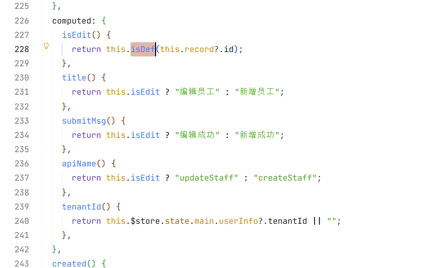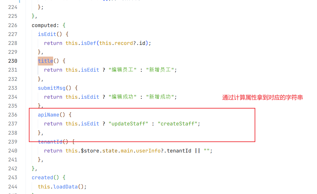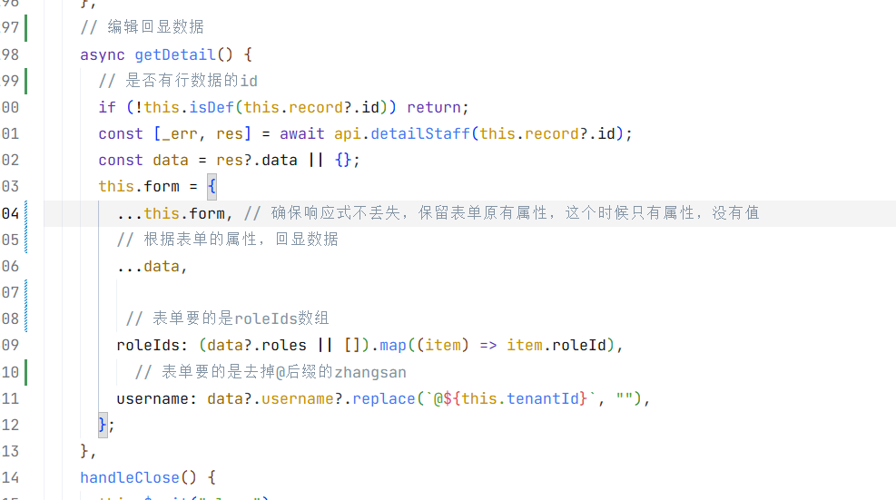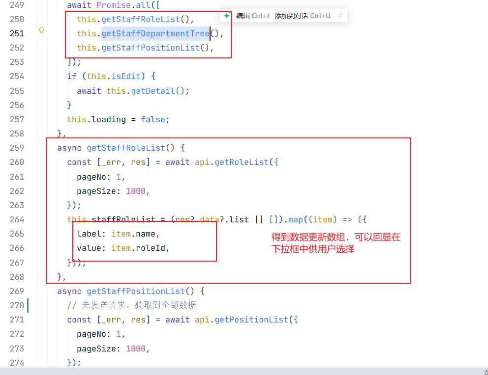 // 编辑场景:执行updateStaff函数 const [err, res] = await updateFn({ ...this.form, userId: this.record.id });// 新增场景:执行createStaff函数 const [err, res] = await createFn({ ...this.form });