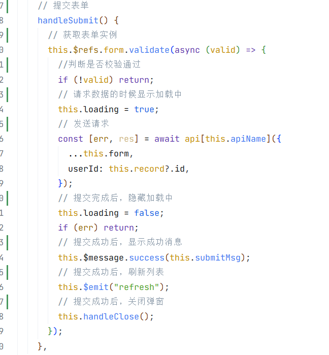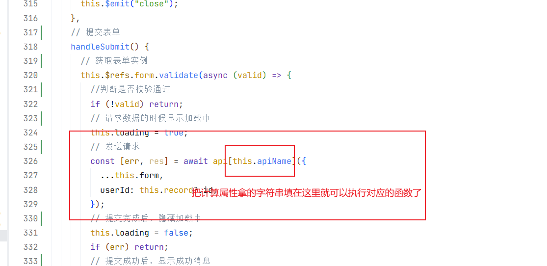 代码里的简写:把"拿函数+执行函数"一步完成 await api[this.apiName]({ ...this.form, userId: this.record?.id });
