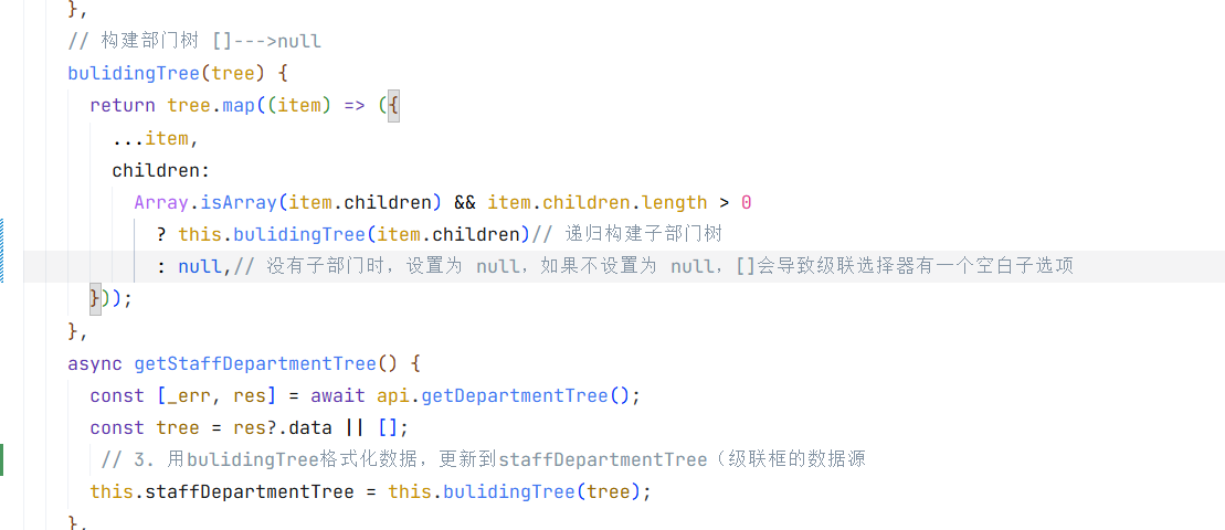 api.getDepartmentTree();通过这个函数,取到部门的数据,然后赋值给tree,把这个tree的数据交给bulidingTree,处理成级联选择器要求的数据结构,然后级联选择器通过绑定 staffDepartmentTree ,这个变量,就能获取处理好的数据,进行回显。