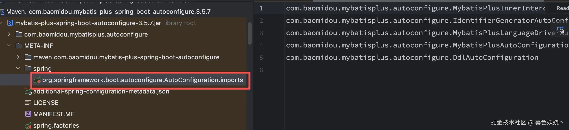 LOCATION = "META-INF/spring/%s.imports" 我们发现它加载了这个路径下的文件,%s 是占位符,然后我们去观察 mybatisplus、redisTemplate 等组件的 starter 依赖库就会明白了