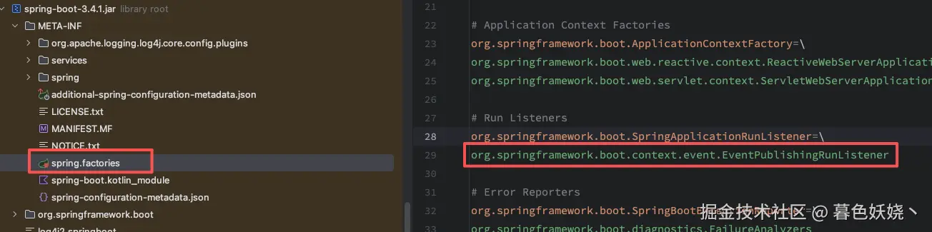 其默认实现类是系统内置的 EventPublishingRunListener 。我们可以看一下它的源码,发现在这些阶段 SpringBoot 发出了对应的事件