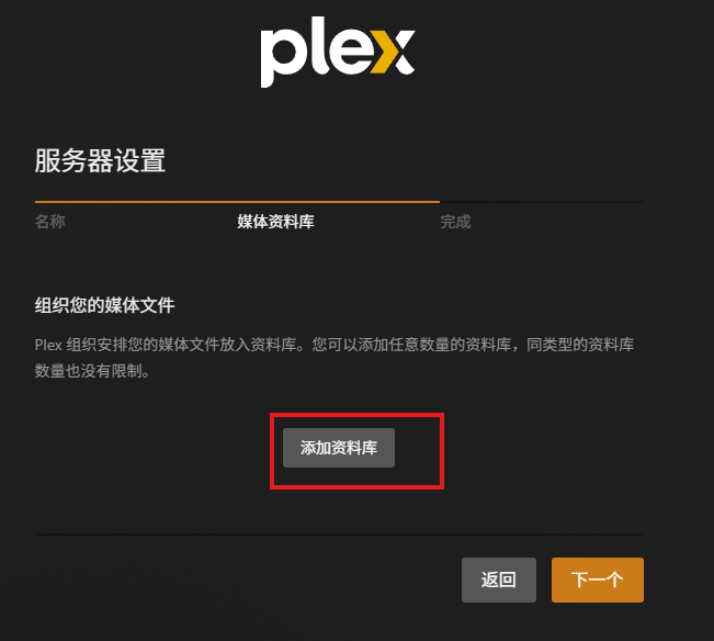 下一步是设备媒体库,这里可以暂时跳过,后续配置;也可以单击"添加资料库",添加媒体文件