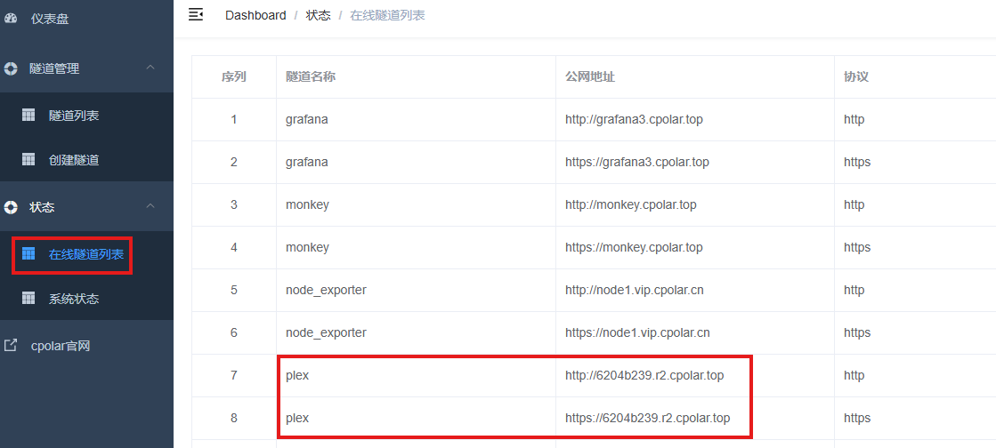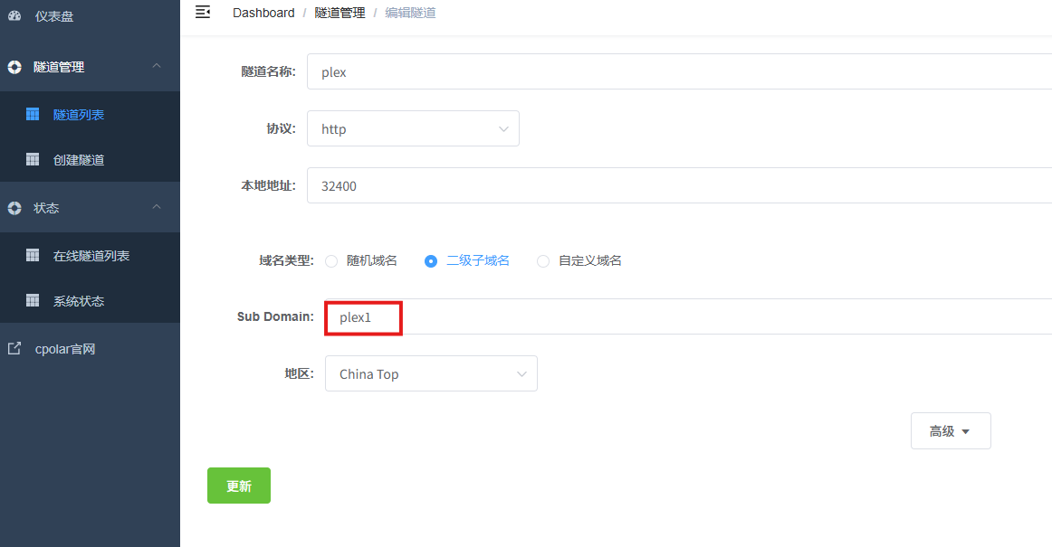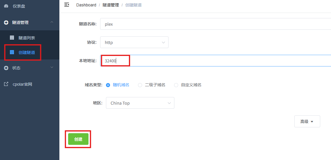 隧道名称:可自定义,本例使用了:plex,注意不要与已有的隧道名称重复