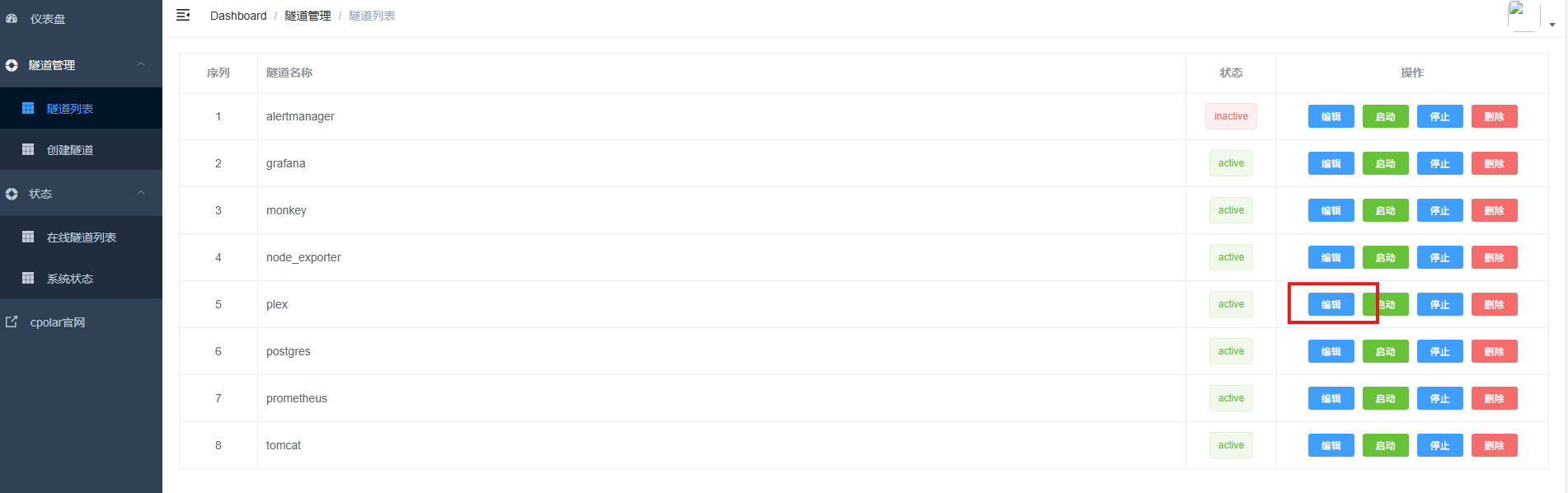 登录cpolar web UI管理界面,点击左侧仪表盘的隧道管理------隧道列表,找到所要配置的隧道plex,点击右侧的编辑。