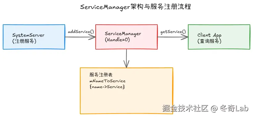 图1: ServiceManager架构 - SystemServer注册服务,Client查询服务,ServiceManager维护服务注册表