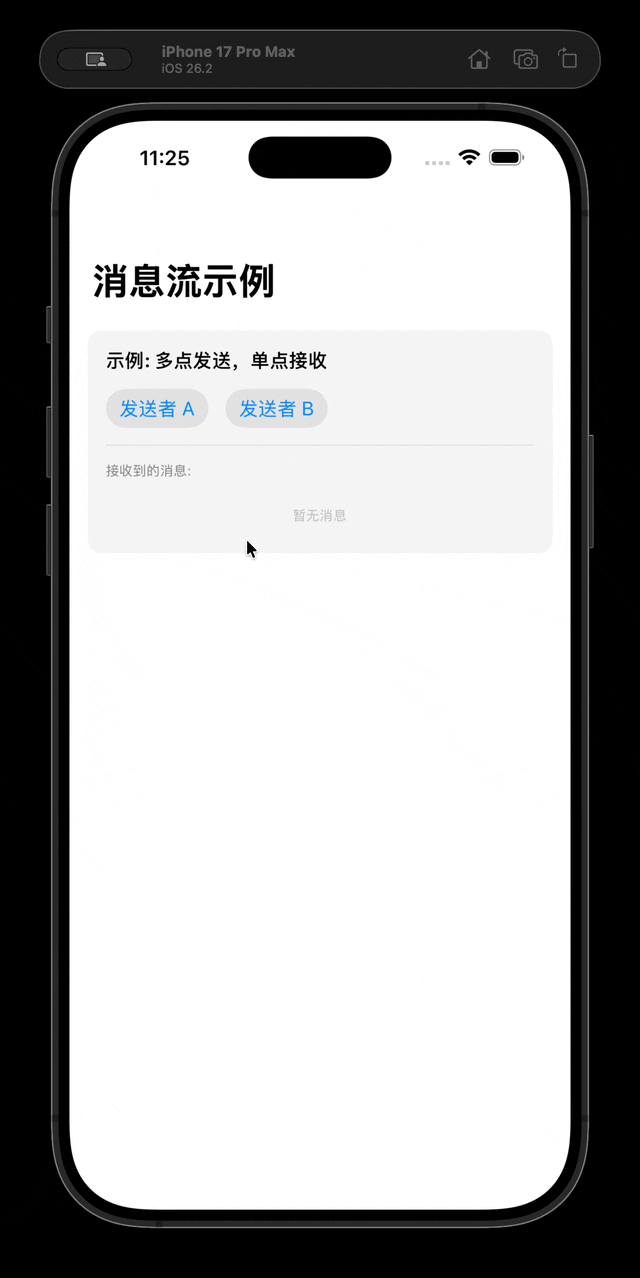 task中监听的流,更新@State会自动切主线程,无需手动调度; - 多接收者:一个流可被多个视图同时监听,实现一对多消息分发;