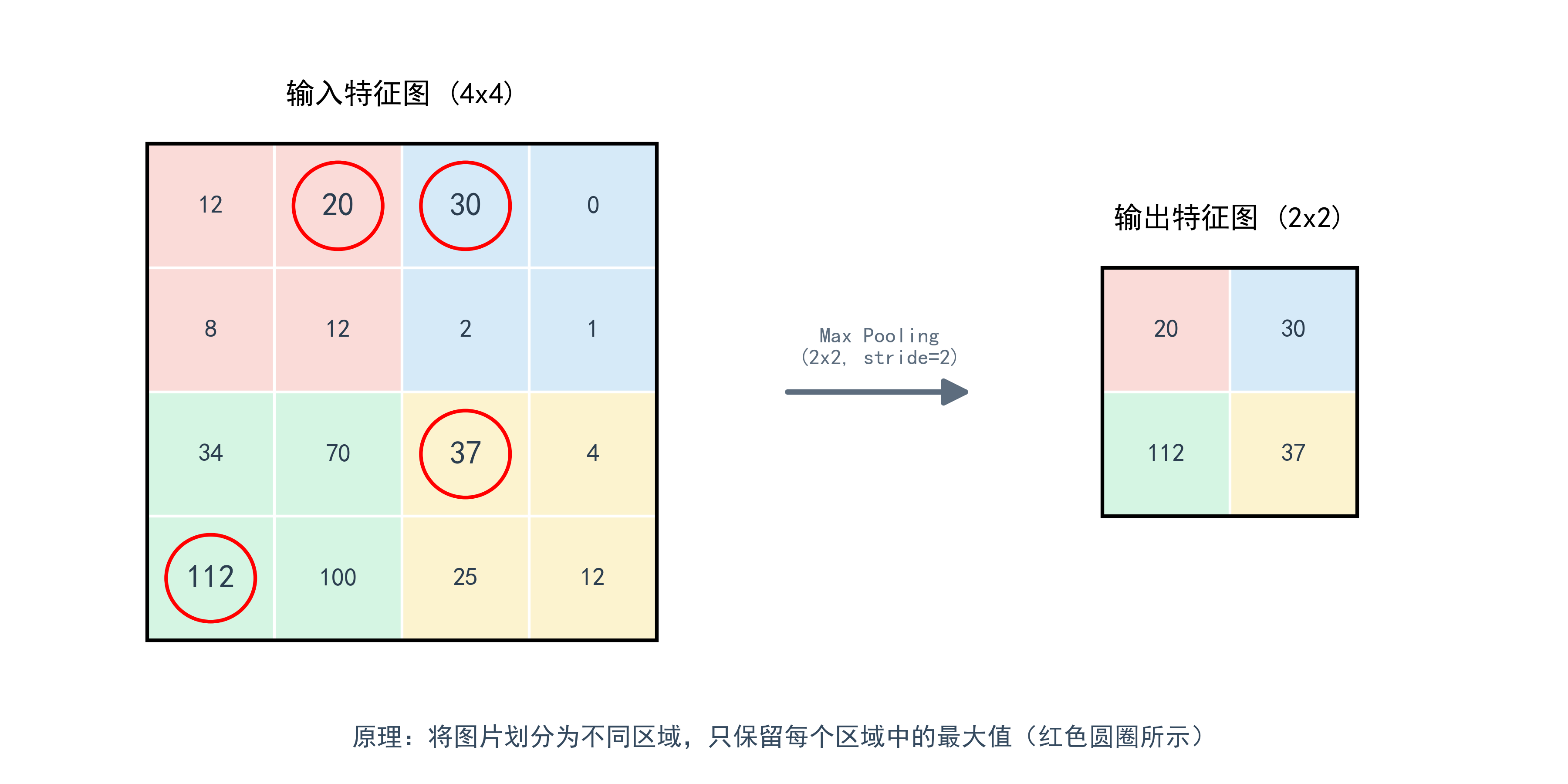 卷积层提取出的特征图往往数据量很大,且包含很多冗余信息。池化层负责在保留主要特征的前提下,对数据进行降维(下采样)。