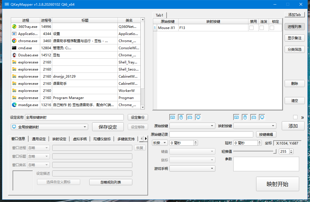 更改为 F13 键映射,增加了新软件,再 使用 QKeyMapper 将 鼠标的侧位键 Mouse-X1 映射到 F13 ,避免和现有的键位冲突,更加方便。