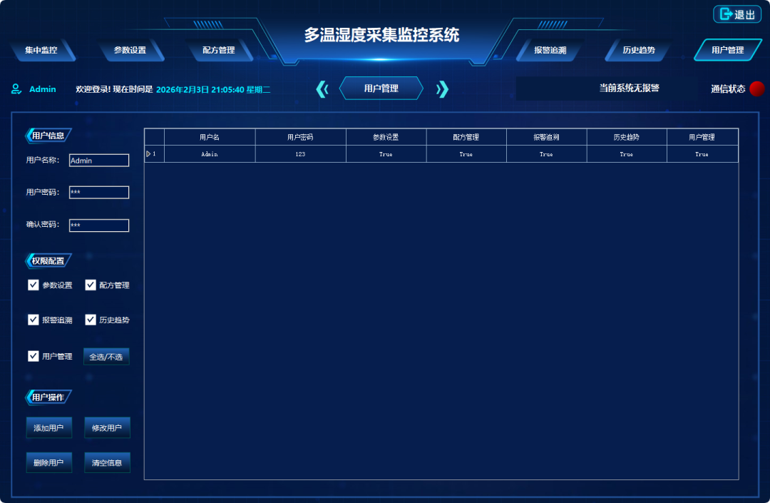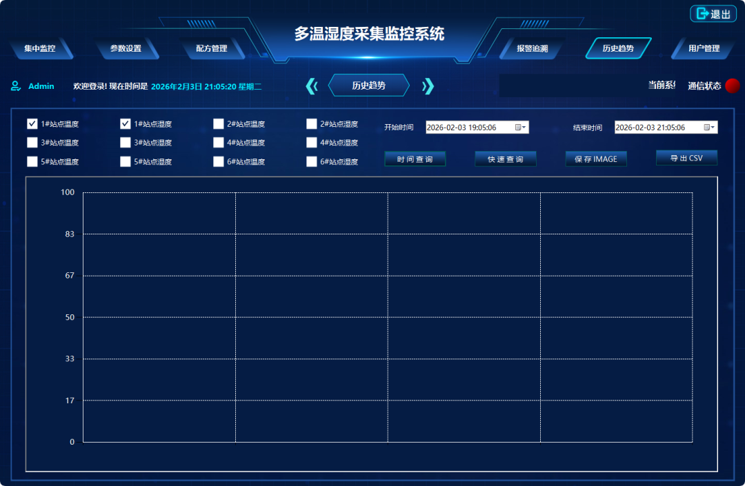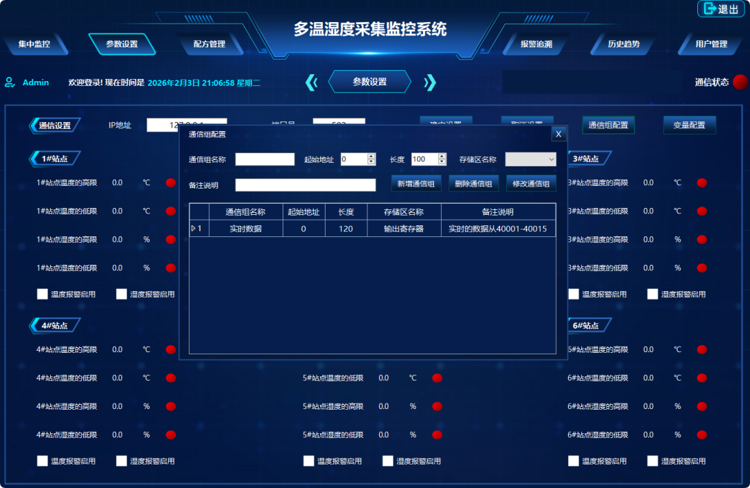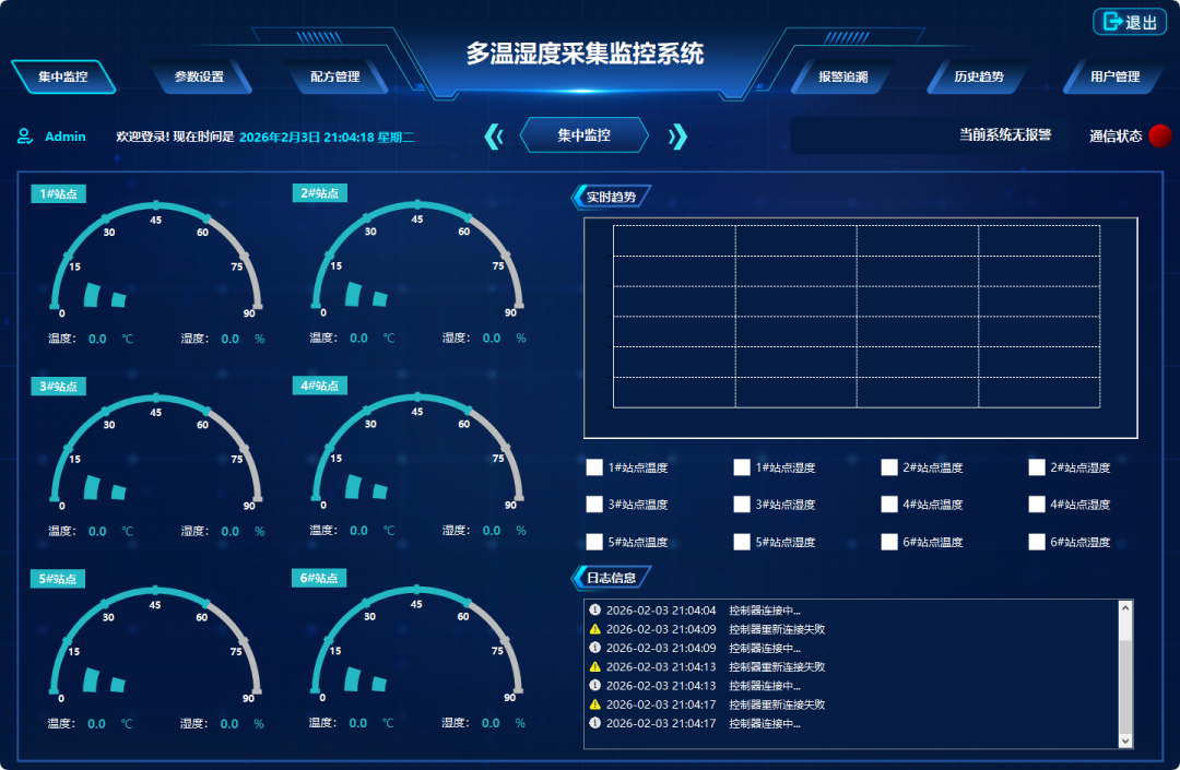 一套基于 Windows 平台开发的工业温湿度集中监控系统,主要服务于拥有多个监测站点(最多6个)的中小型制造或仓储场景。