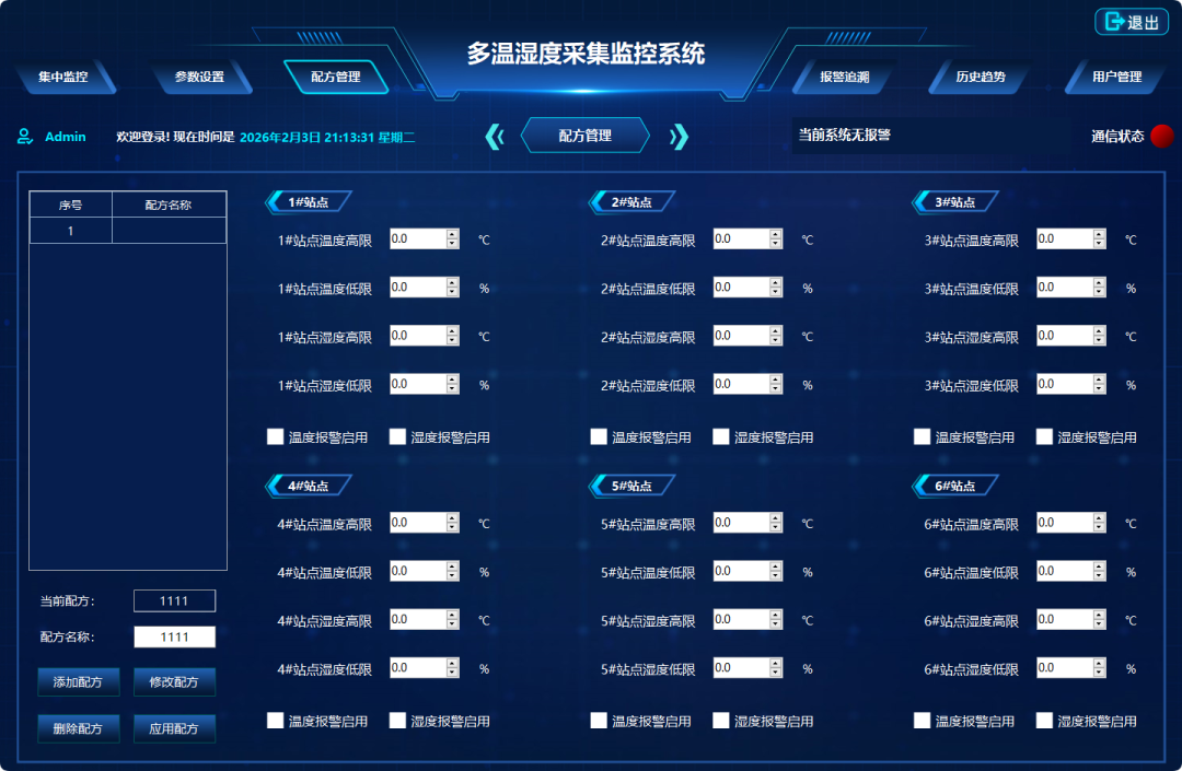 支持保存多套温湿度控制策略(每套包含6个站点的上下限及报警使能状态),可一键下发至设备;