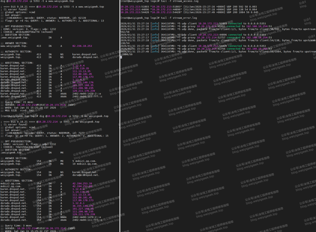 步骤 05.作者在内网中使用 coredns 搭建了一个 DNS 服务,现通过 Nginx 反向代理该域名解析服务器,测试 DNS 服务是否正常。